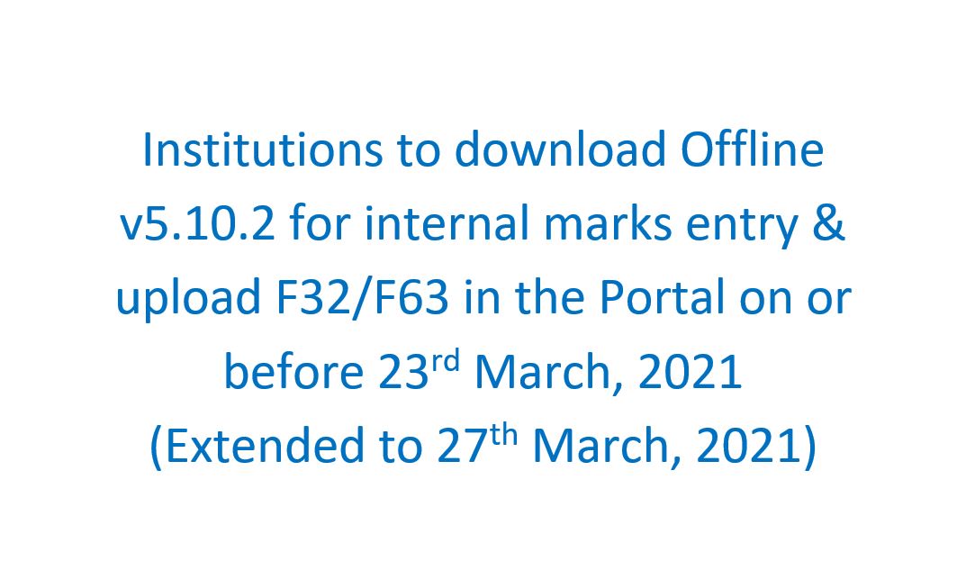 Institutions may download offline v 5.10.2 to enter form 32 & form 63 and upload the csv zip files in the portal on or before 23rd March ' 2021 from school login.Last date extended to 27th March'2021